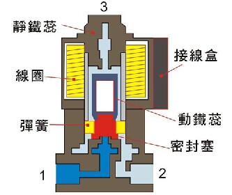 當(dāng)電磁閥線圈通電時(shí),接口3通向接口1,1與2關(guān)閉;